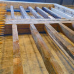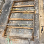 Les bois ont été nettoyées et retaillés pour former un cadre et des colombes, assemblés à tenons et mortaises chevillés bois. Ce mode de construction fait partie du guide des bonnes pratiques du torchis, il a été un peu adapté au projet pour économiser du bois: dans des cloisons ou des murs traditionnels les colombes qui accueillent les éclisses sont plutôt des palançons, plus fins, mais aussi moins longs car les cadres structurels sont souvent plus petits.